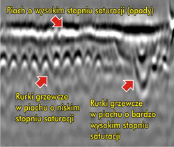 Po pokryciu całej powierzchni stadionu i przeanalizowaniu danych udało się wykryć miejsca wycieków. Jeden z przykładów prezentujemy obok. Odpowiednio opracowany plik wyraźnie obrazuje różnice między rurkami bez zmian i rurkami, które są uszkodzone.