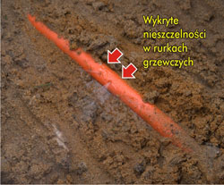 Jak widać na zdjęciu poniżej - poszczególne uszkodzenia są wielkości dziurki po igle i żadna inna metoda nie zdała tu egzaminu. Jedynie badanie georadarowe jest w stanie tak dokładnie określić miejsce wycieku zwykłej wody (do momentu uzyskania szczelności systemu grzewczego nie używano mieszanki glikolowej).
